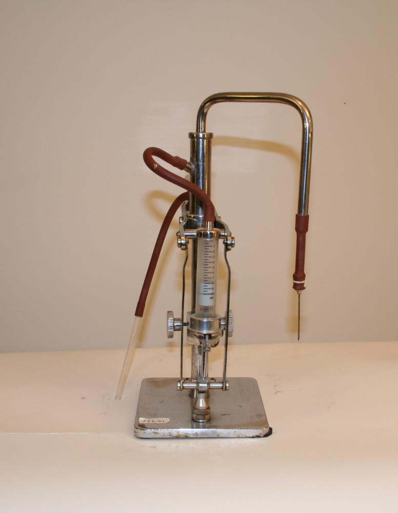 Dæla á krómuðum fæti, með gúmmíslöngu til þess að setja ofan í kolbu með vökva og aðra slöngu sem tengir nál og glersívaling með kvarða. Dælan var notuð til að dæla litlu magni af vökva í lykjur (ampúlur), hettuglös og augndropaglös.