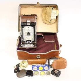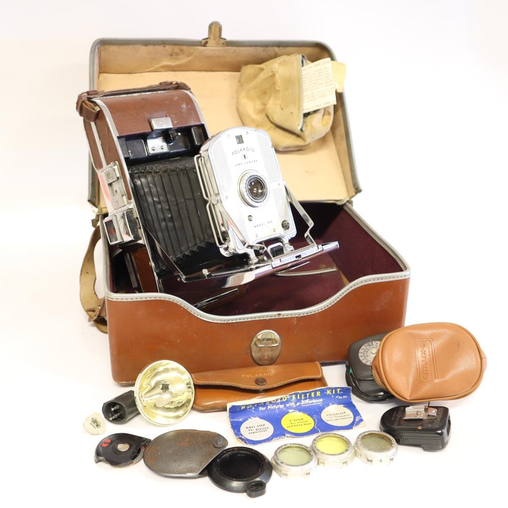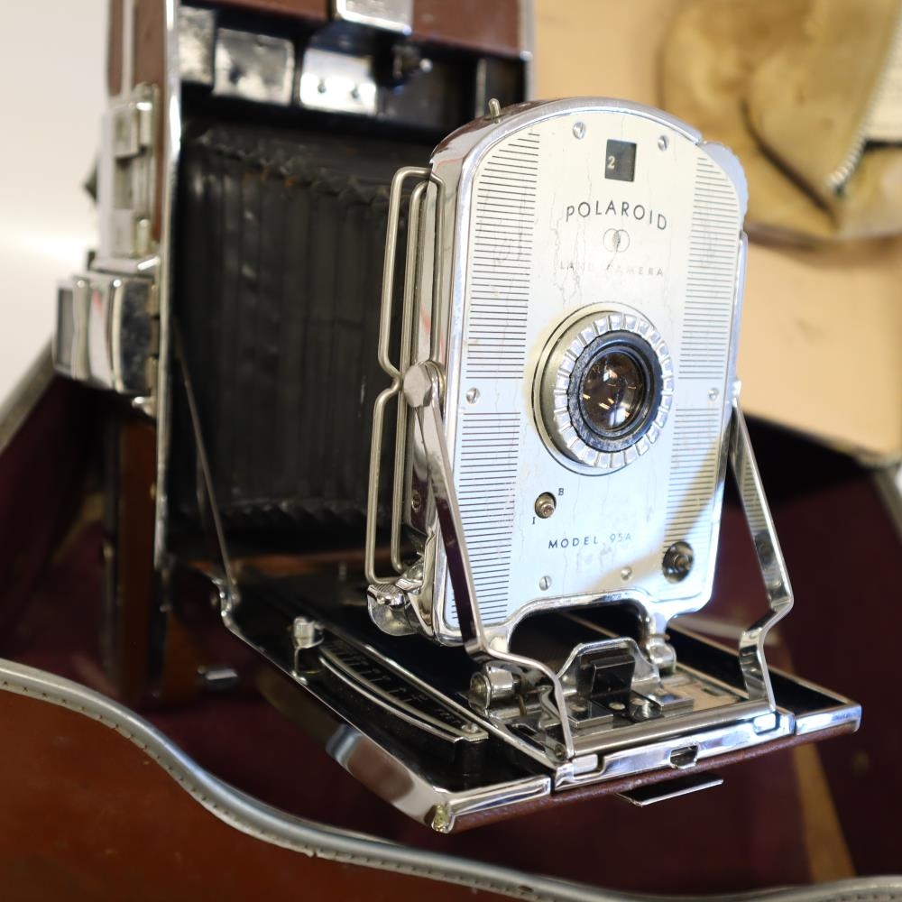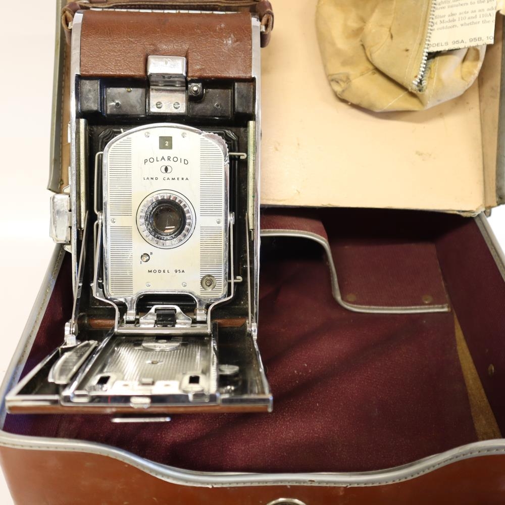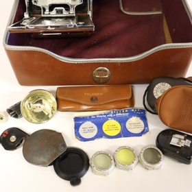 Polaroid myndavél af gerðinni Land Camera model 95a. Með vélinni fylgir: Leðurtaska, útdregin linsa á belg, Cittilux-L flass, Polaroid flass, Polaroid ljósmælir, 4 - 5 light reducer filter í hulstri, 3 stk. Polaroid filter í leðurtösku og leiðbeiningabæklingar með vélinni. Sumir fylgihlutirnir eru bilaðir. Fyrri eigendur voru hjónin Helga Þórdís Tryggvadóttir frá Bjarnastöðum í Garði og Eyjólfur Gíslason frá Miðhúsum í Garði.