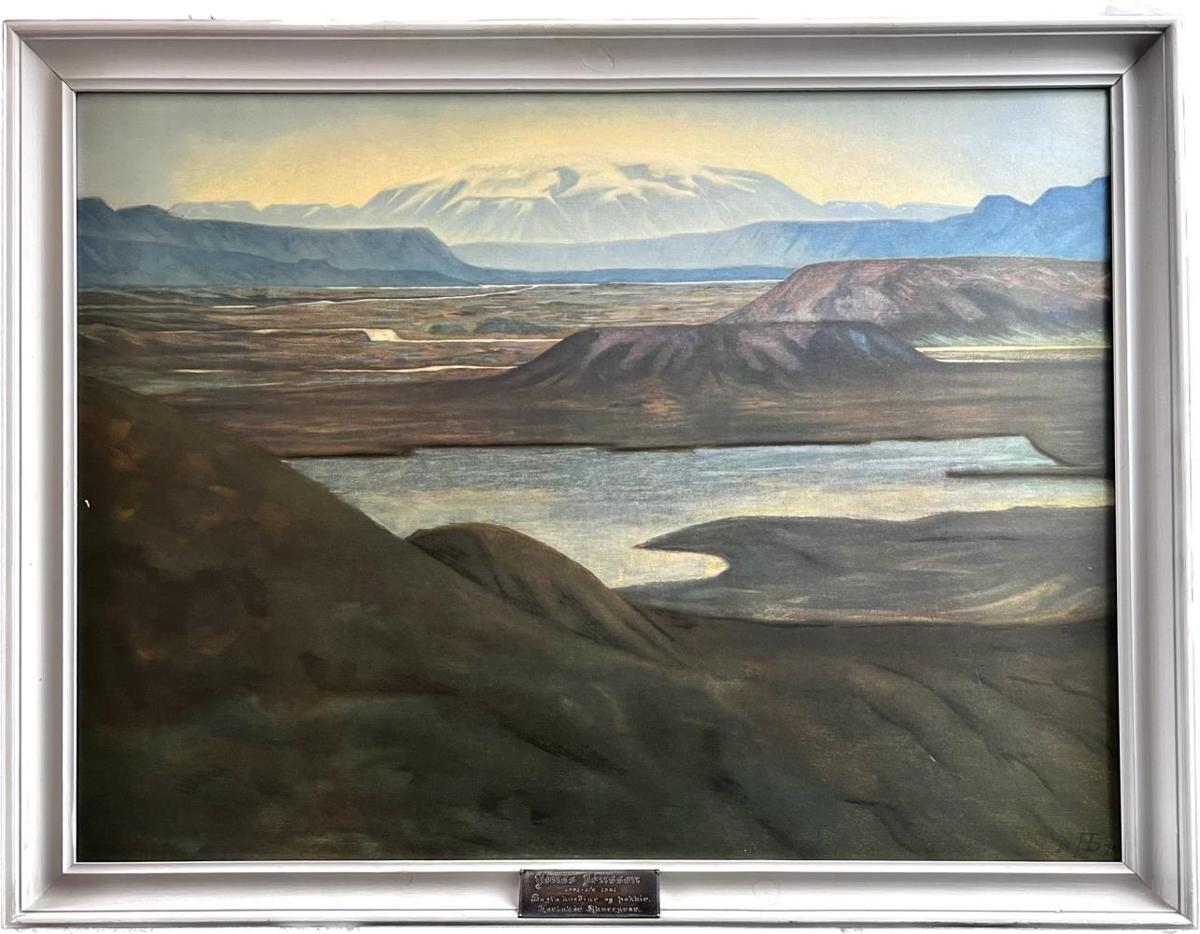 Eftirprentun af Heklu eftir Þórarinn B. Þorláksson. Á ramma myndarinnar er skjöldur sem á stendur : Jónas Jónsson 1901 - 1/6 - 1961 - Bestu kveðjur og þakkir. Karlakór Akureyrar.