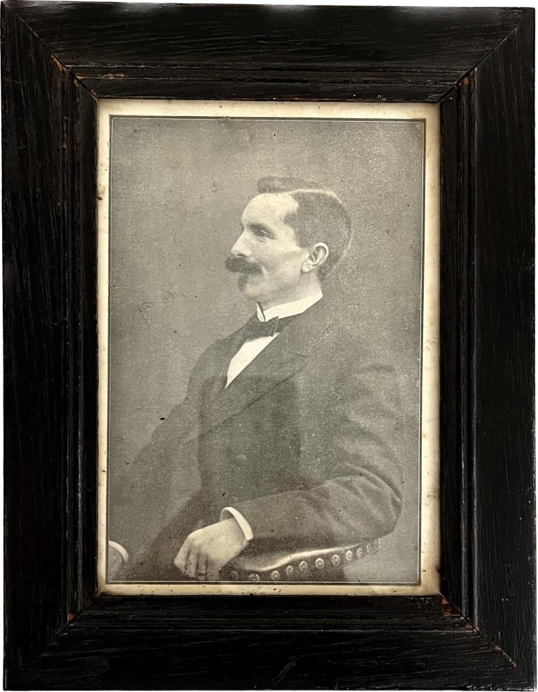 Myndarammi úr tré, svartmálaður. Útklippt svarthvít mynd af Hallgrími Kristinssyni sem situr á einhverju og tyllir armi sínum á skreyttann hlut. Yfirvaraskegg, þverslaufa.