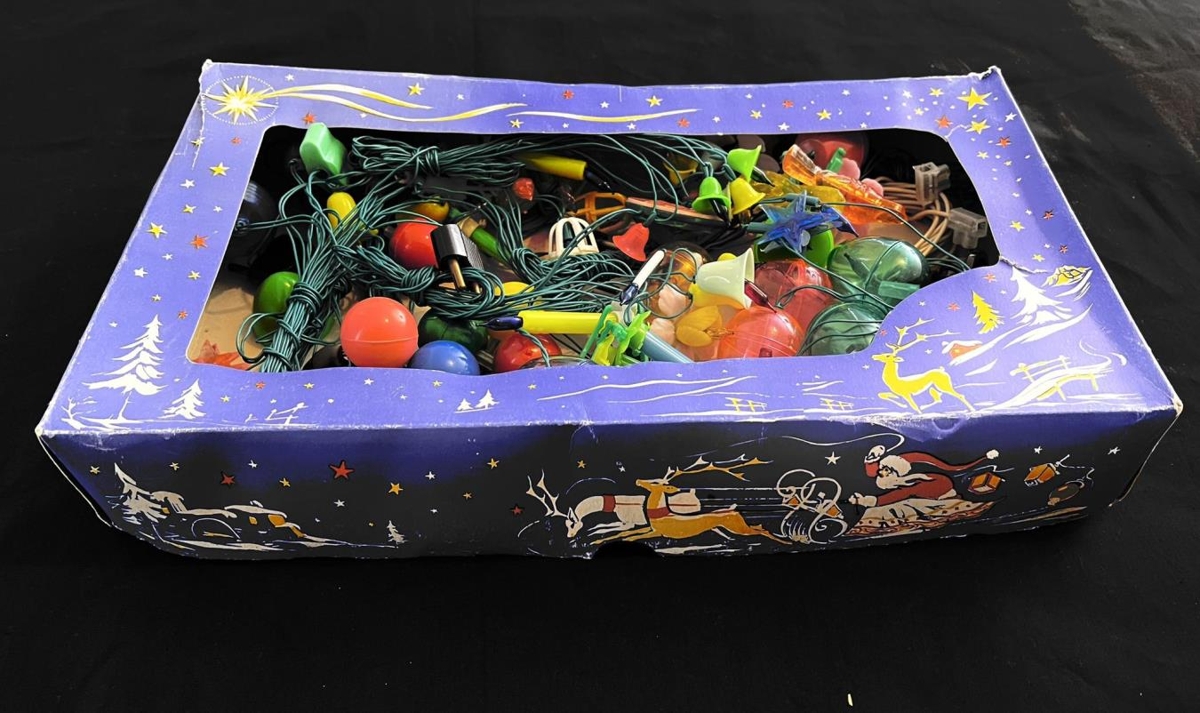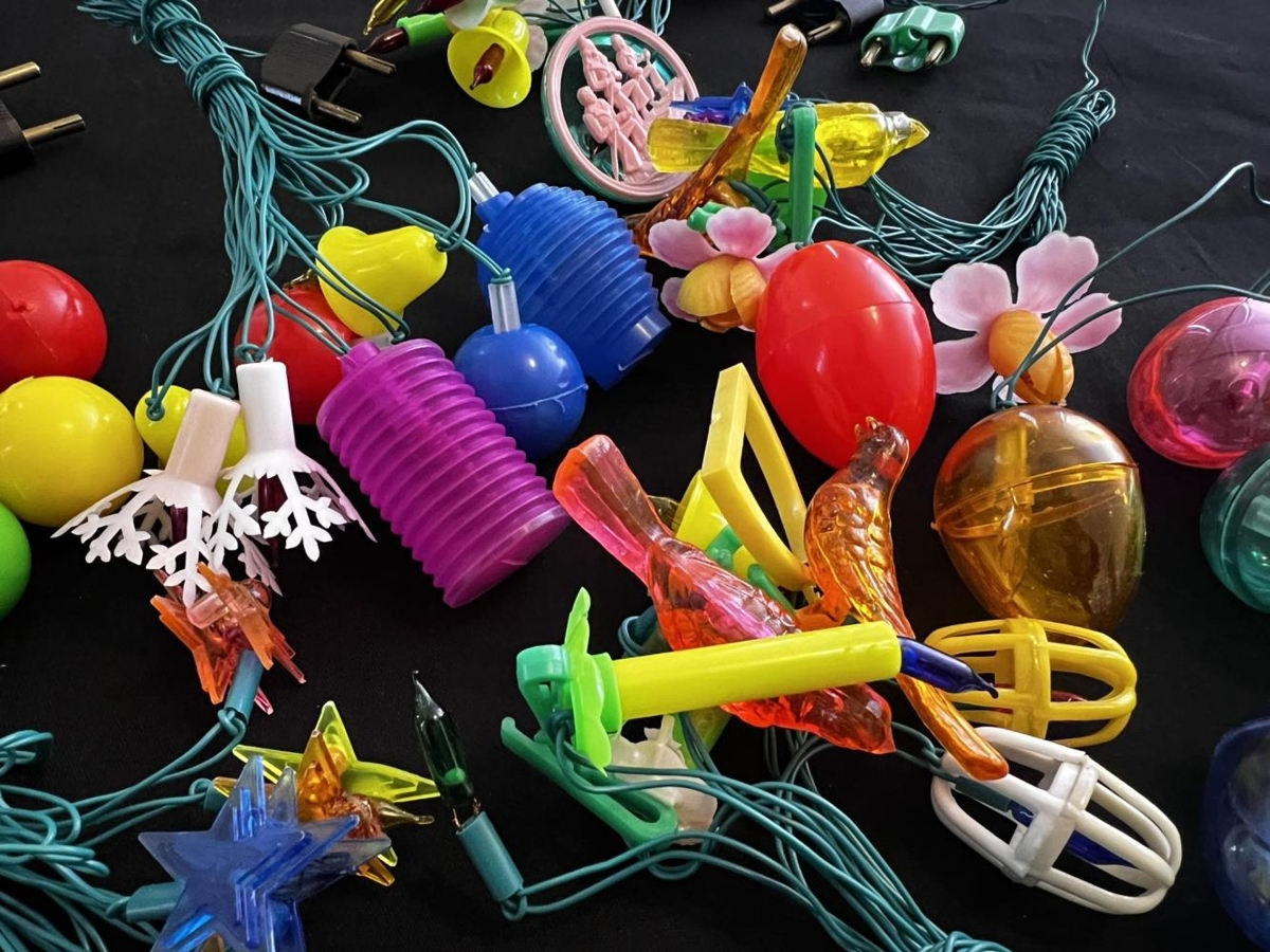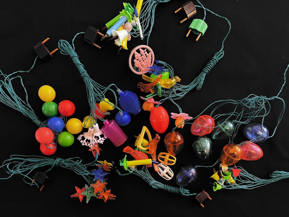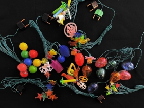 Jólaskraut frá Jónasi E Einarssyni og Báru Gestsdóttur. Seríurnar eru úr Amaró en þær voru teknar úr sölu og aldrei notaðar því vírarnir voru hættulegir. Seríurnar eru með allskonar plasti utan um perurnar; Kúlum, kertum, luktum, fuglum, blómum osvfrv. Upprunalegar umbúðir, plast í lokunum er farið að rifna.