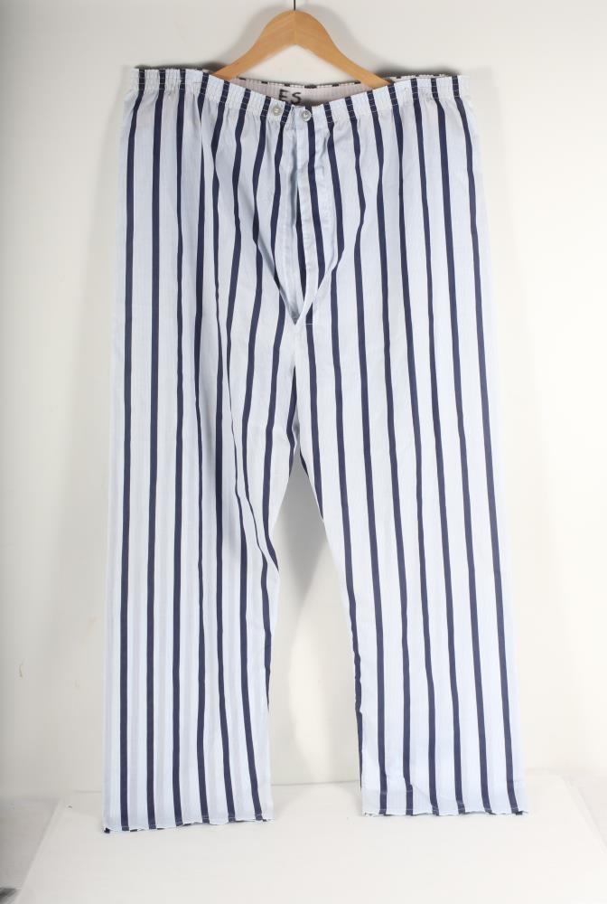 Blár og ljósbláar, röndóttar náttbuxur. Inn í strenginn hefur verið skrifað "ES" með tússpenna. Voru í eigu Einars Sigbjörnssonar (1901-1995), bónda í Ekkjufellsseli.