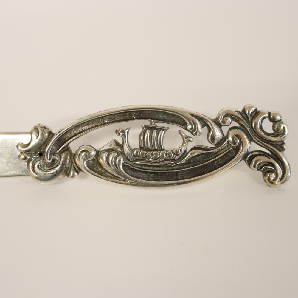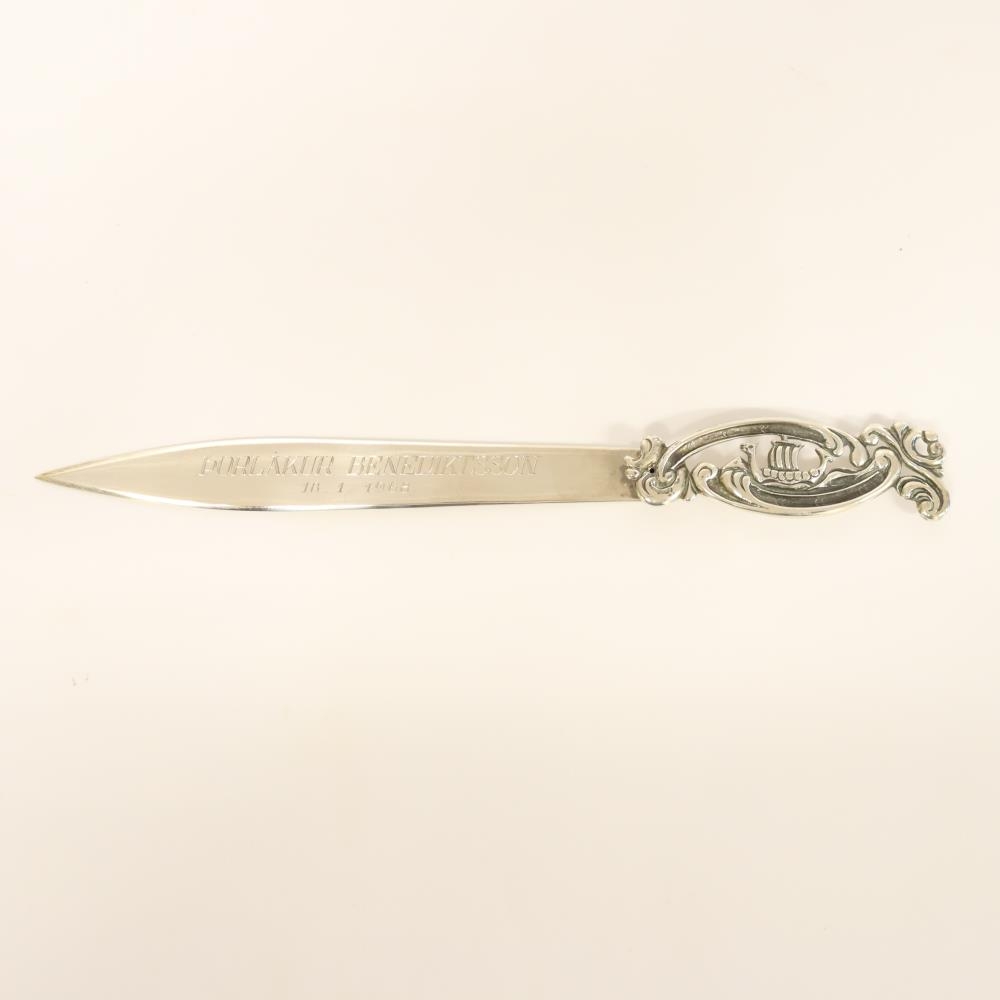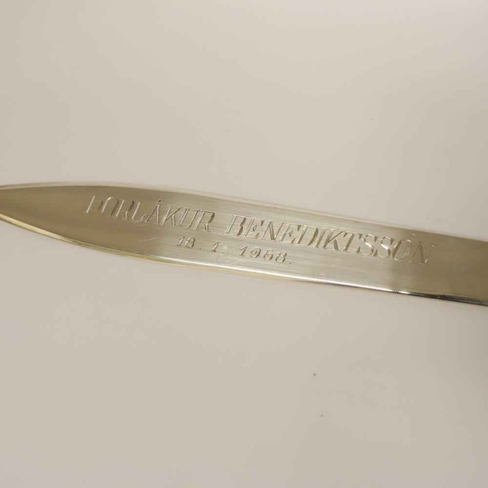 Bréfahnífur silfurbúinn og útskorinn. Fyrri eigandi var Þorlákur Benediktsson kaupmaður í Akurhúsum í Garði og er hnífurinn merktur honum. Bréfahnífurinn var gjöf til Þorláks á 80 ára afmælinu hans 18. janúar 1968.