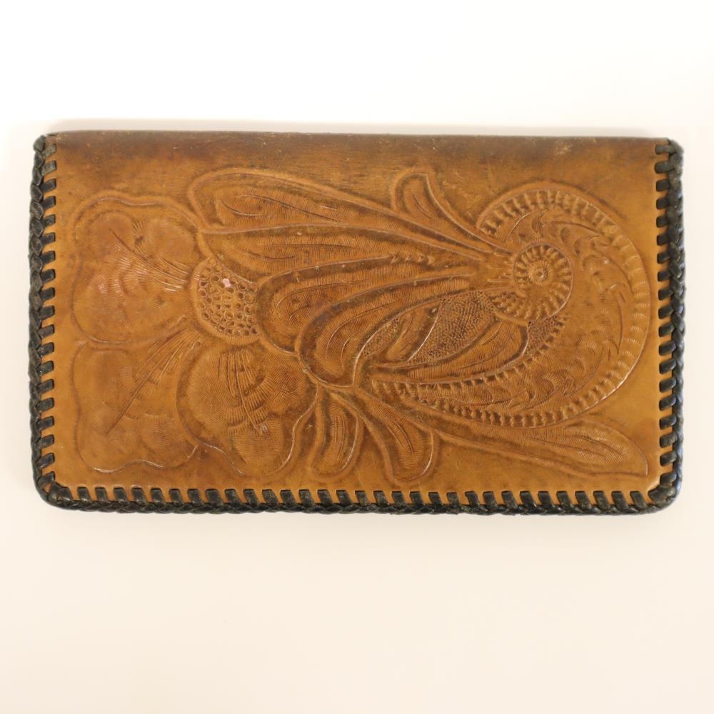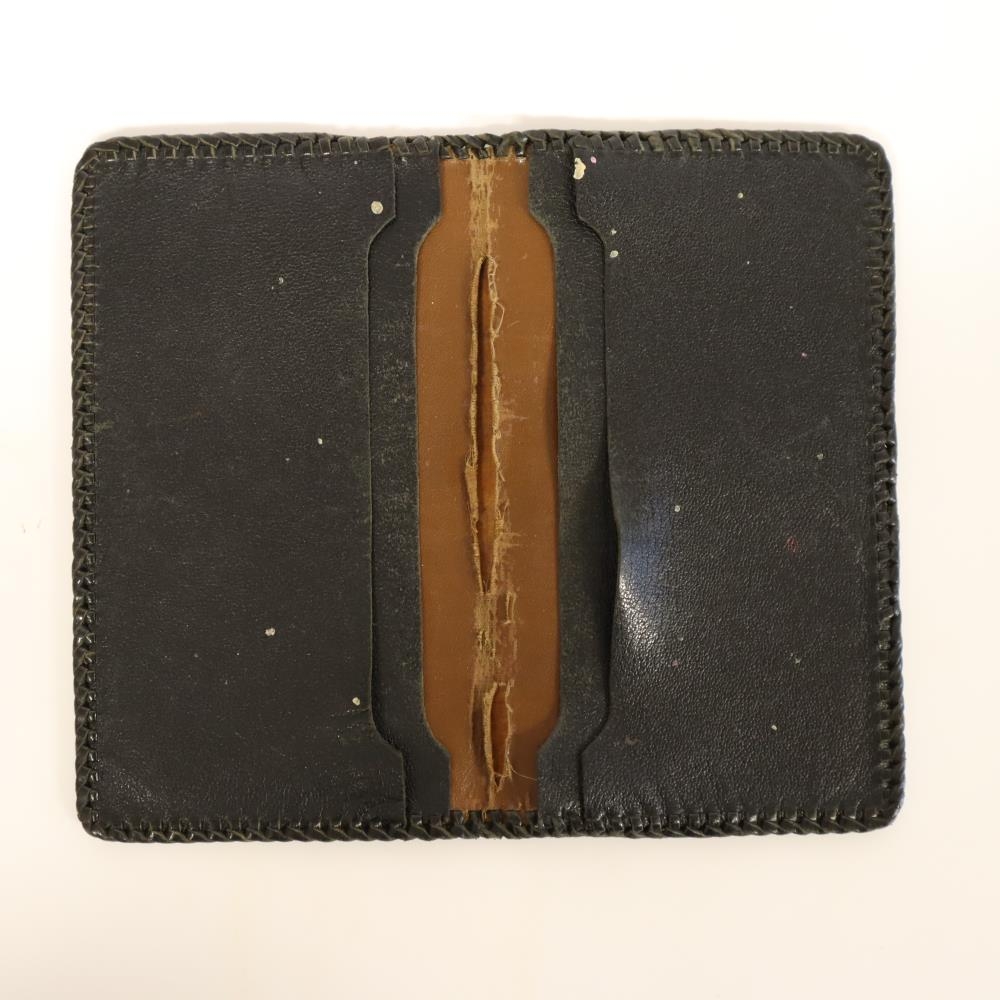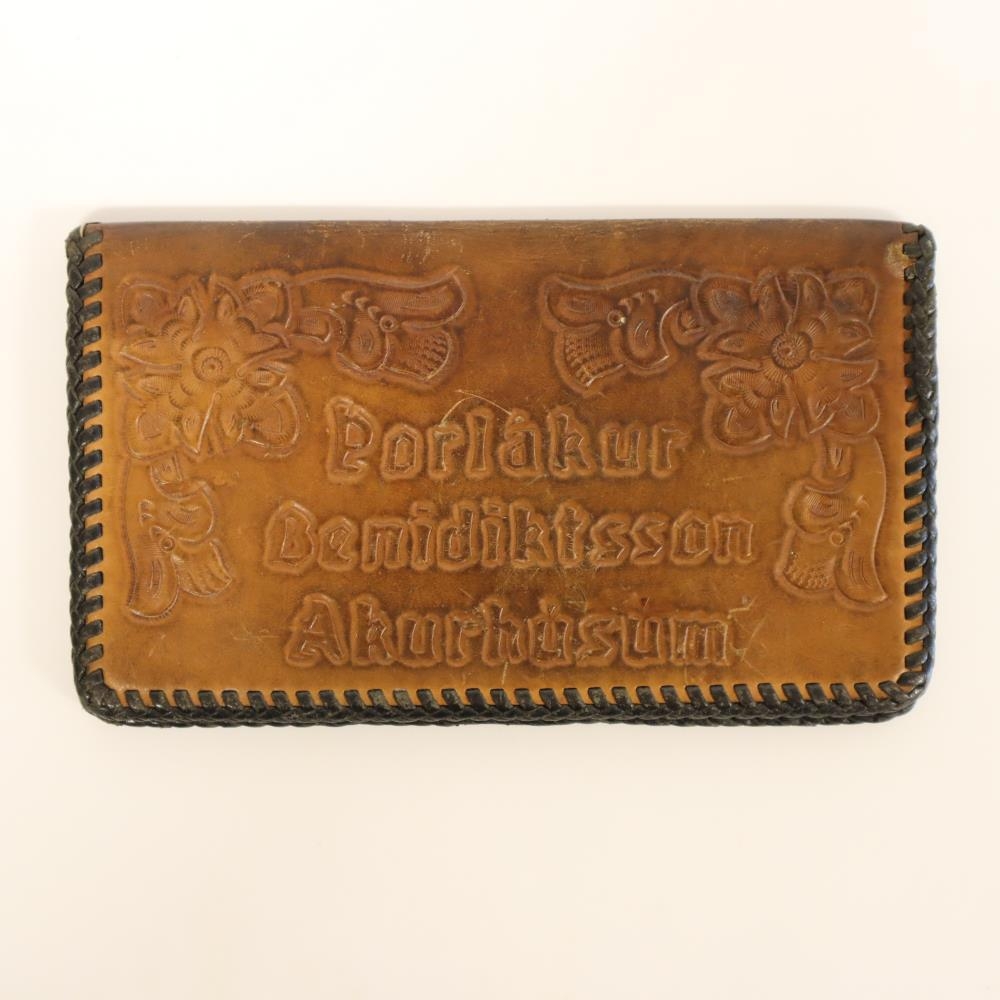 Seðlaveski úr leðri. Fyrri eigandi var Þorlákur Benediktsson kaupmaður í Akurhúsum í Garði, nafn Þorláks er greypt í veskið ásamt fallegu skrauti öðru.