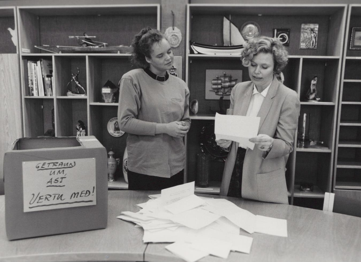 75 ára afmæli ASÍ í mars 1991. T.v. Anita Pálsdóttir og Lára V. Júlíusdóttir starfsmenn ASÍ draga í verðlaunagetraun vegna 75 ára afmælis ASÍ í mars 1991.