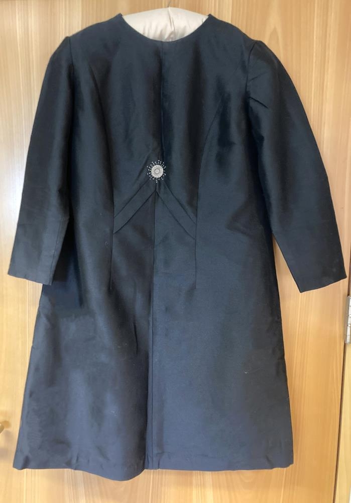 Kjóll. Heimasaumaður úr svörtu efni og fóðrarður með svörtu fóðursilki. A-snið, síðerma, rennilás að aftan. Kringt hálsmál. Ísaumaður silfurlitaður skrauthnappur að framan, litlar perlur ísaumaðar í kring.