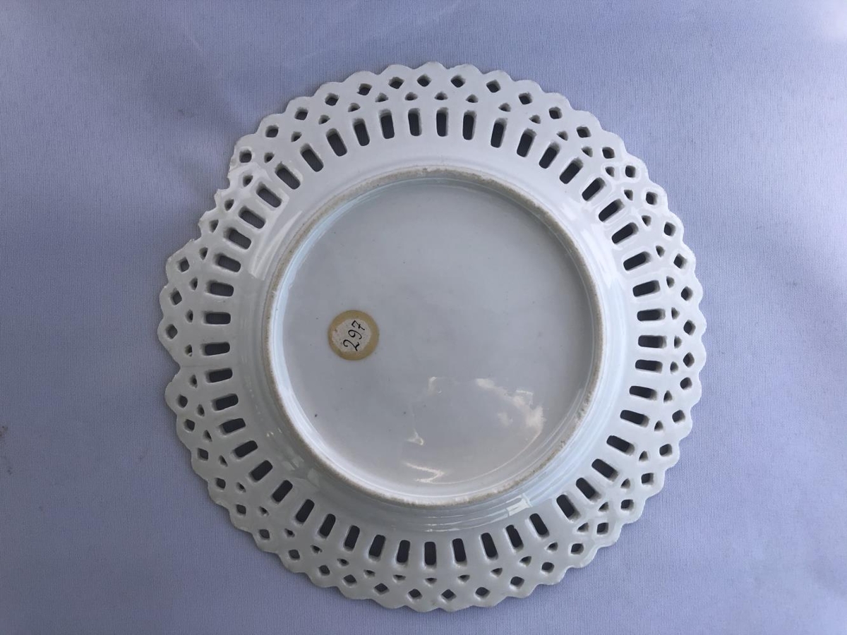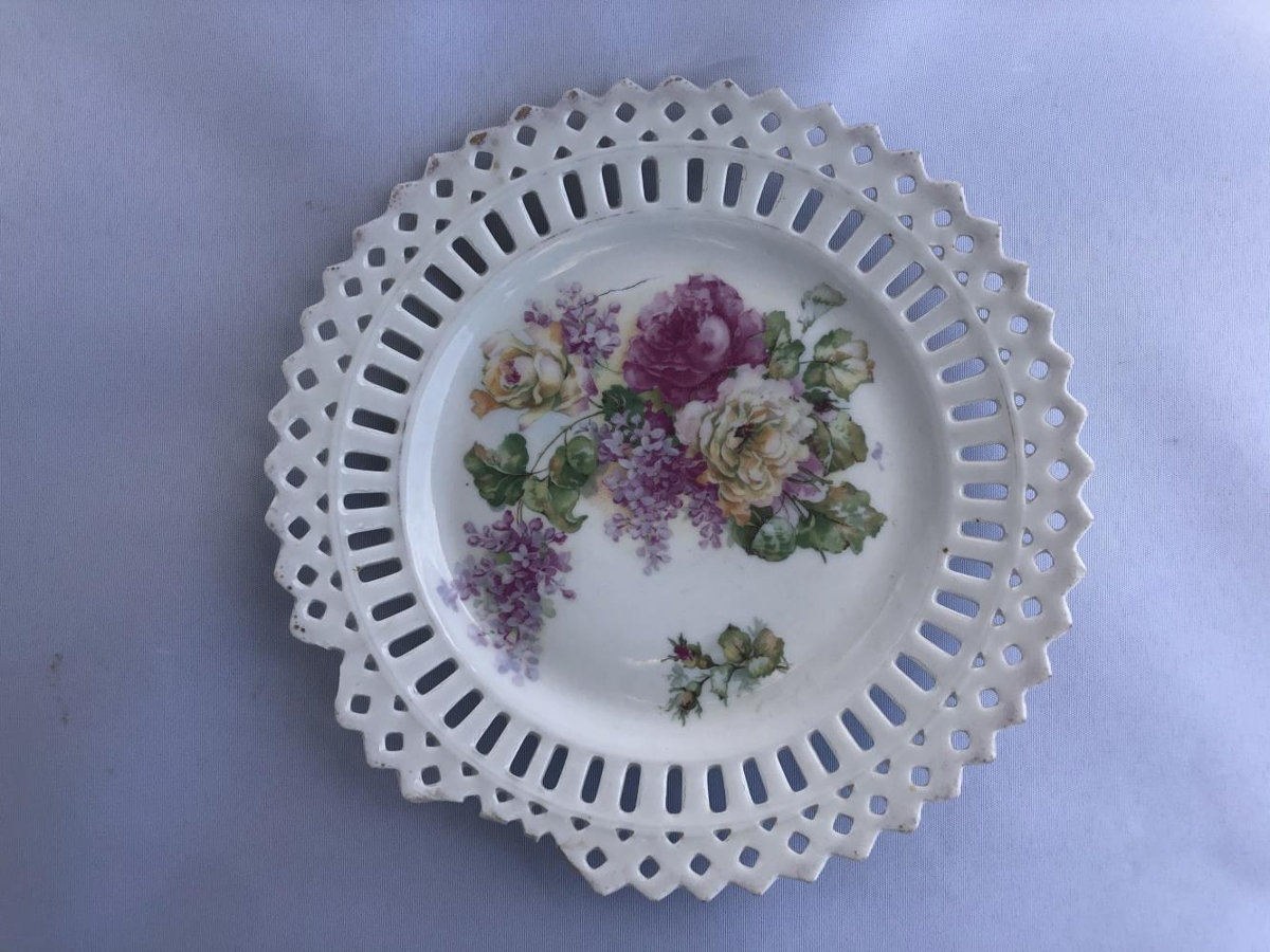 Kökudiskur með laufarósum á börmum og rós í miðjunni. Keyptur í Eyrarbakkaverslun árið 1906.
