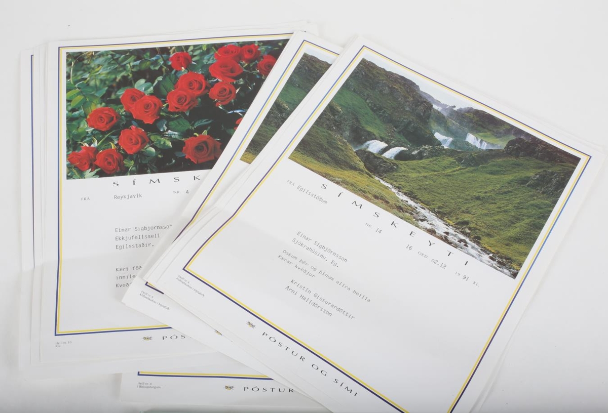 18 stykki símskeyti, stíluð á Einar Sigbjörnsson (1901-1995) bónda í Ekkjufellsseli í Fellum í tilefni 90 ára afmælis hans árið 1991. Kemur úr búi Einars og Jónu Jónsdóttur (1903-1983) frá Ekkjufellsseli í Fellum.