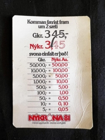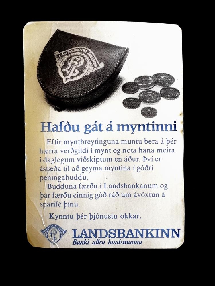 Lítill auglýsingamiði frá Landsbankanum frá árinu 1981. Leiðbeiningar varðandi myntbreytinguna og viðskiptavinir hvattir til að gæta upp á smámyntina sína sem varð verðmætari eftir breytinguna og viðskiptavinir fengu nýja smámynta peningabuddu.