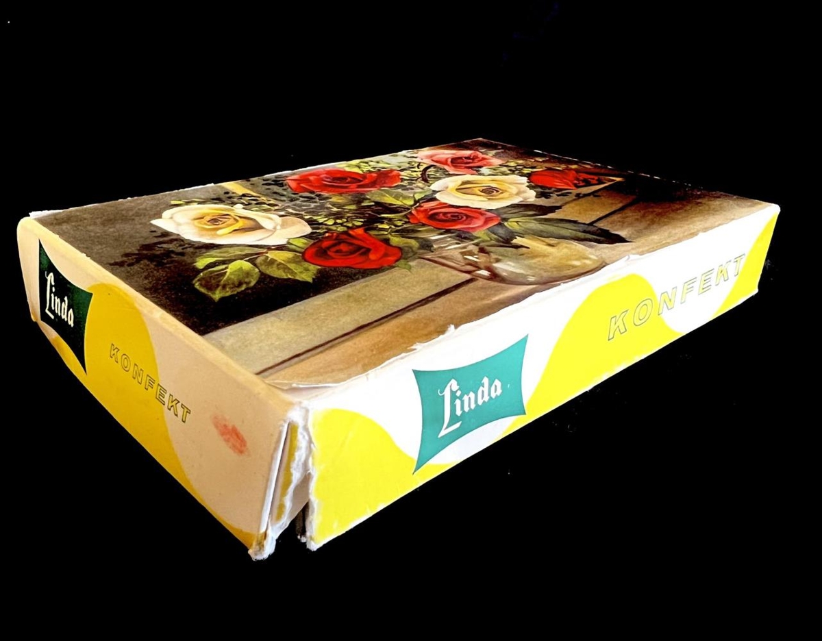 Lítill gulur konfektkassi, tómur, með mynd af blómaskreytingu á lokinu.