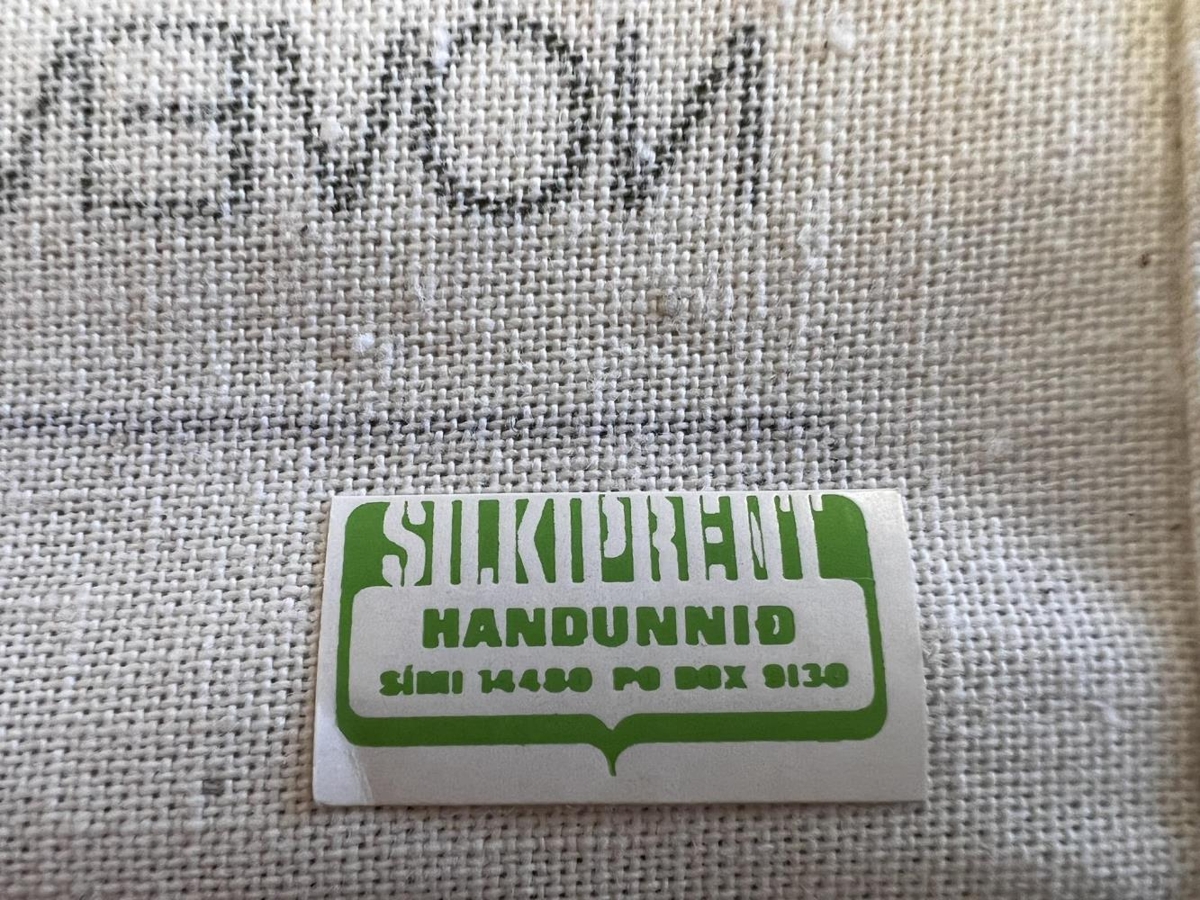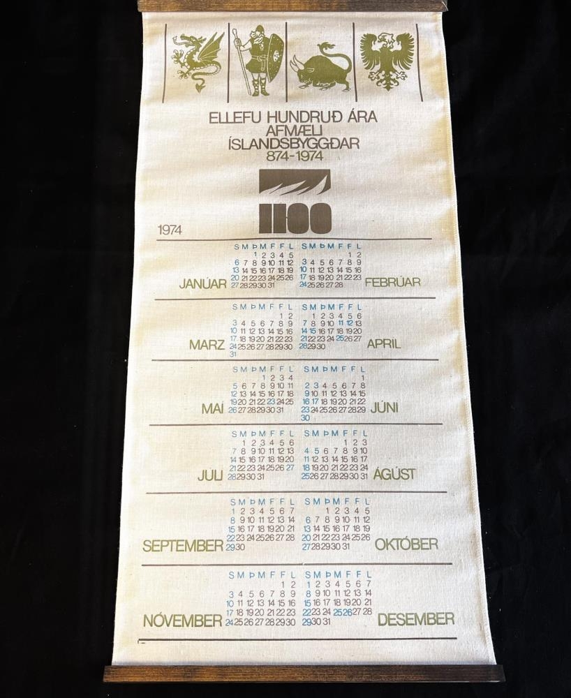 Dagatal, taudregill með viðarspýtum á hvorum enda. Prentað með grænum myndum og svörtu letri, grunnur ljós. Myndir af landvættum Íslands og áletrun: Ellefu hundruð ára afmæli Íslands. 874-1974 - 1100. Er í pappahólk með vermiða frá Blómabúðinni Laufás, Akureyri. Aftan á dagatalinu er miði sem á stendur : Silkiprent, Handunnið s. 14480
