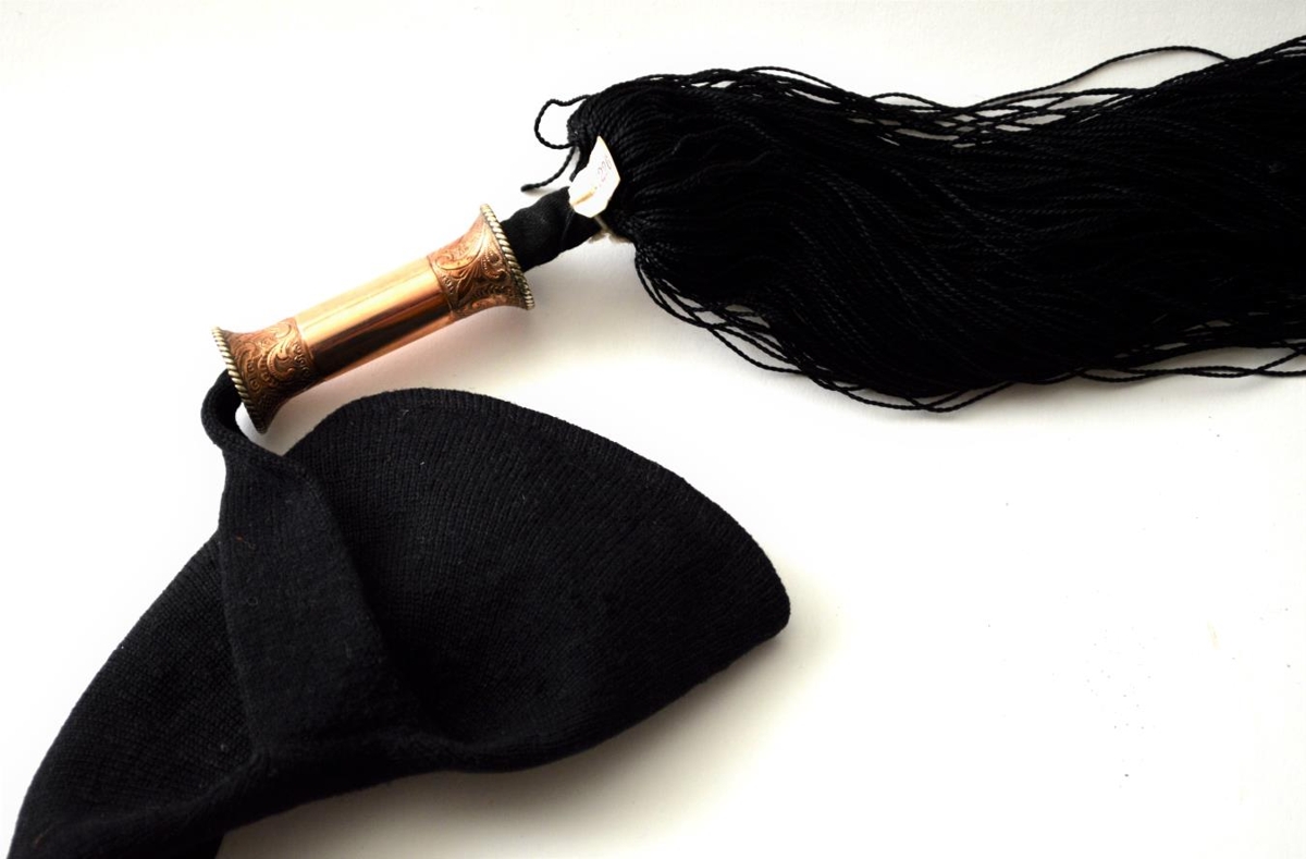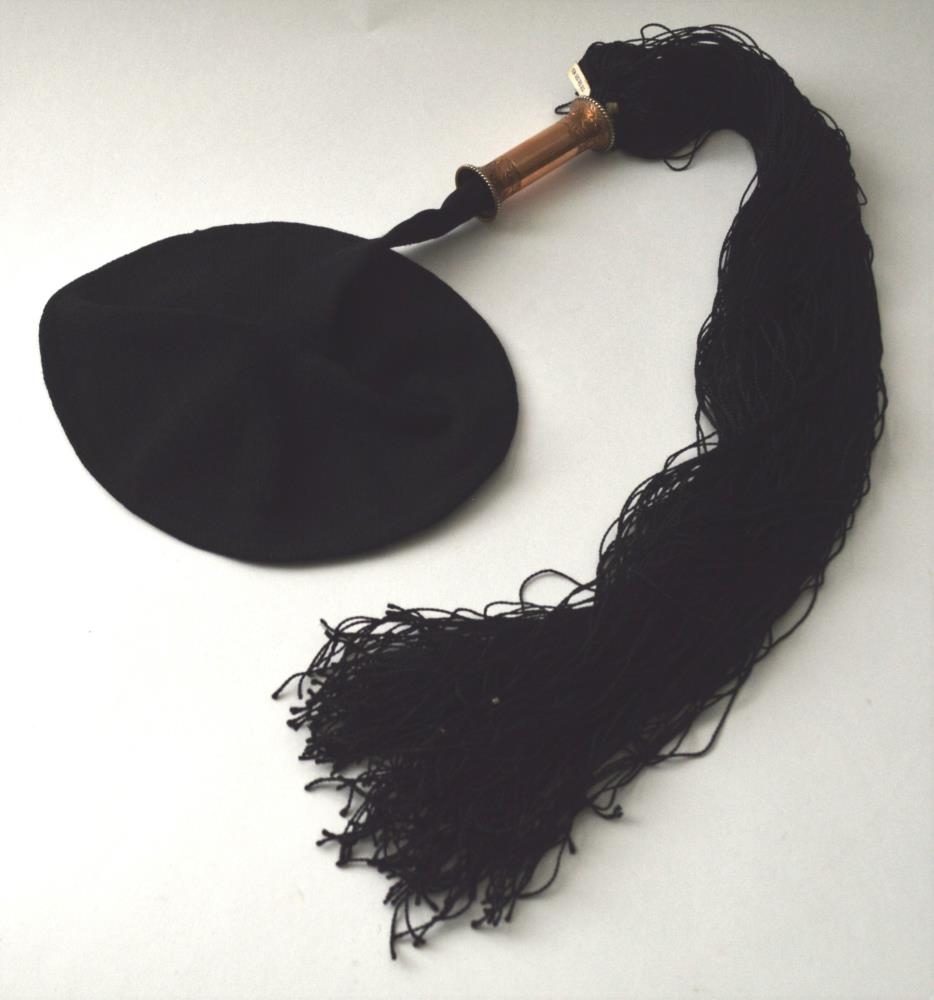 Skotthúfa með silfurhólk, gullroðnum. Elín Kjartansdóttir prests í Holti u. Ey., Einarssonar, átti þessa húfu um 1910 og fór með hana til Canada.