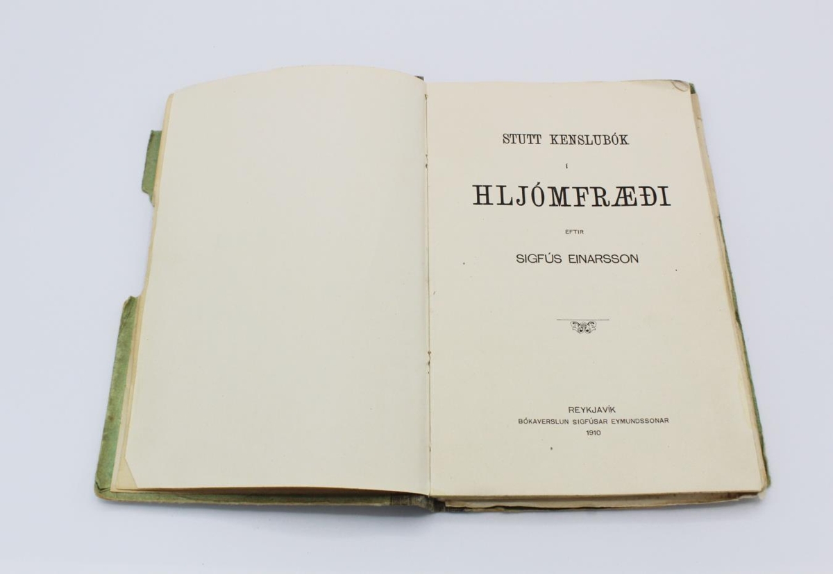 Stutt kennslubók í hljómfræði eftir Sigfús Einarsson 1910. Kemur úr dánarbúi Magneu Gróu Sigurðardóttur.