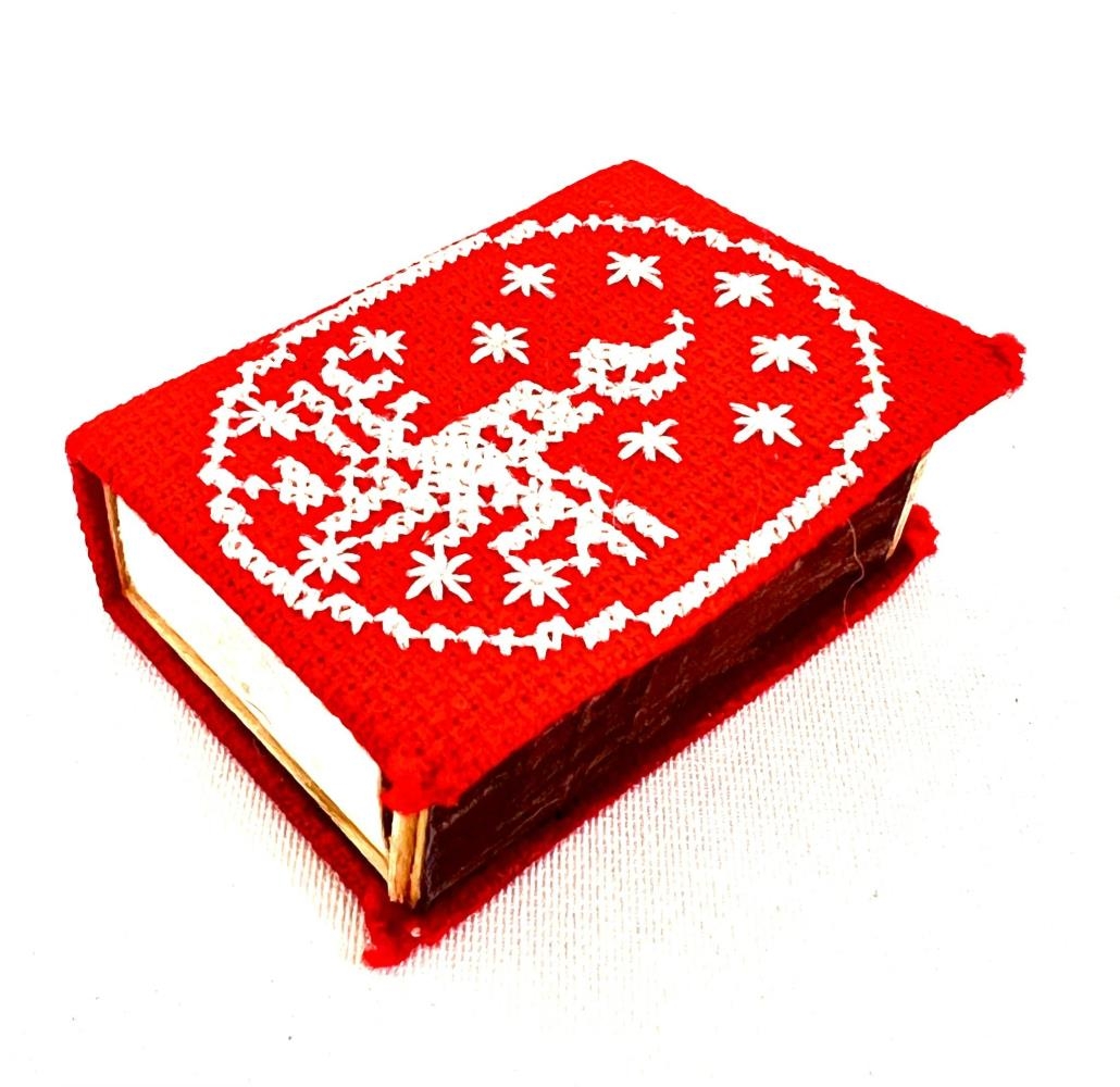 Eldspýtustokkur sem búið er að sauma utan um rautt efni, krosssaumað, með hvítu munstri af kerti og stjörnum.