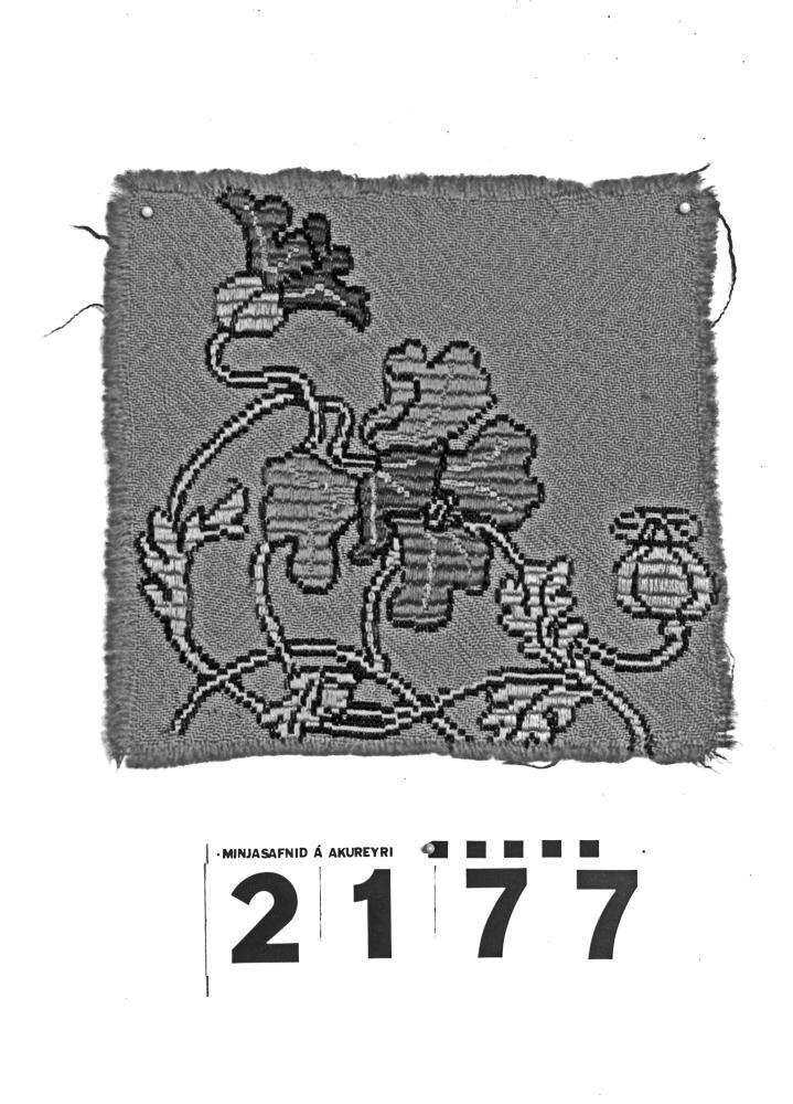 og saumað í hann með rauðu, svörtu og gráu. Púðaborðið er saumað