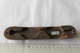 Hluti af gleraugnahúsum úr tré (helmingur) og er skorið á ártal, 1912. Verk Eyjólfs Ólafssonar á Ytri-Sólheimum.
