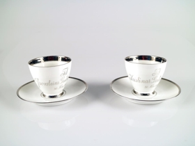 Tvö samskonar bollapör úr postulíni. Meðfram innanverðum börmum bollanna er silfurmáluð rönd, fyrir neðan önnur þynnri. Handföng bollanna eru einnig silfurmáluð. Meðfram botni bollanna er silfurmáluð rönd á gáróttu undirlagi. Á bollunum eru áletranir í silfurmálaðri skrift. Á öðrum þeirra stendur "Til Þorsteins Guðmundssonar. 30. Nóv. 1902." en á hinum bollanum er áletrunin "Til Kristínar Gestsdóttur, 30. Nóv. 1902.". Þvermál bollanna er 8,1 cm. Undirskálarnar eru í stíl við bollana. Meðfram börmum þeirra er silfurmáluð rönd. Samskonar rönd, þó þynnri, liggur hringinn í kringum þar sem bollarnir sitja. Þvermál undirskálanna er 14,1 cm. Engin merking er undir bollunum né undirskálunum sem gefur til kynna hvar bollapörin eru framleidd.