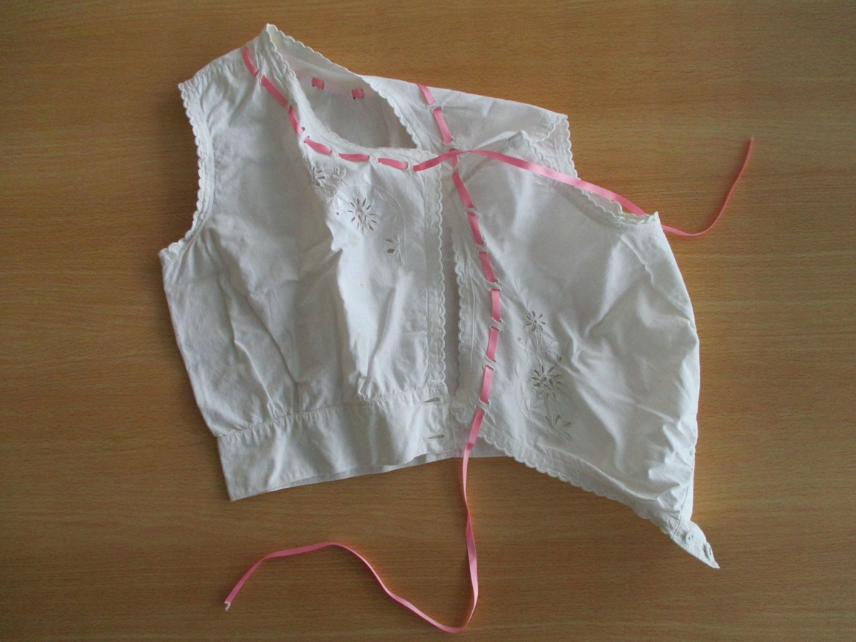 Undirlíf með flatsaumi og gatasaumi og saumuð göt til að draga í silkiband, unnið af Guðlaugu frá Syðra-Velli seinna búsett á Galtastöðum í Gaulverjabæjarhreppi. Er með bleiku silkibandi sem er dregið í götin, og hneppt neðst með tveimur tölum og er 40,0 sm á síddina.