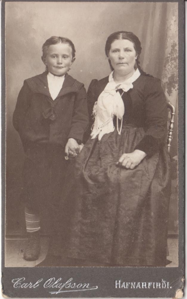 Þórhildur Högnadóttir með uppeldisson sinn, Guðlaug Þorsteinsson sem kallaður var Lilli í Hraunkoti en það nefndist bær þeirra sem nú er Kirkjuvegur 12.