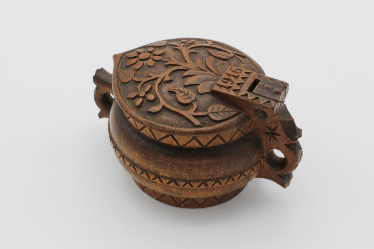 Lítill askur, þvermál á botninum er 5,5 sm. Með hönkum beggja megin útskornu loki og ártalinu 1916. Jóhann Guðmundsson var orðlagður smiður og listfengur við það sem hann fékkst við.Var giftur Bríeti Þórólfsdóttur dáin 28.2.1970, en Jóhann lést 1928 aðeins 39 ára gamall. Gripir númer BÁ: 1176-1193 eru gefnir af börnum Bríetar og Jóhanns, að henni látinni, og eru allir smíðaðir af Jóhanni.