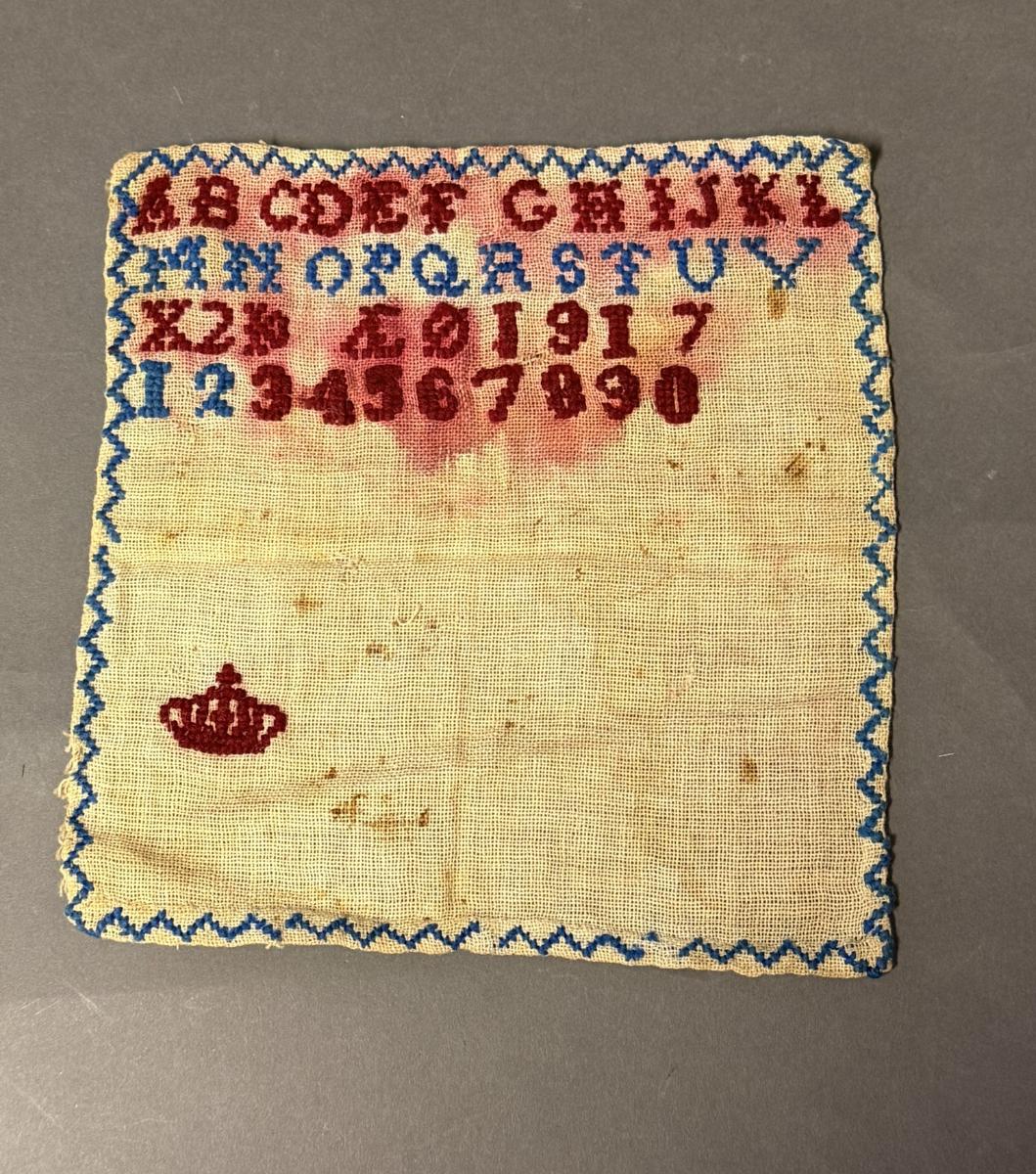 Stafaklútur frá 1917, sennilega frá Felli í Mýrdal: Stafróf, tölustafir, kóróna. Grunnur er ekki fylltur út. Gefið af Elínu Þorsteinsdóttur í Skógum.