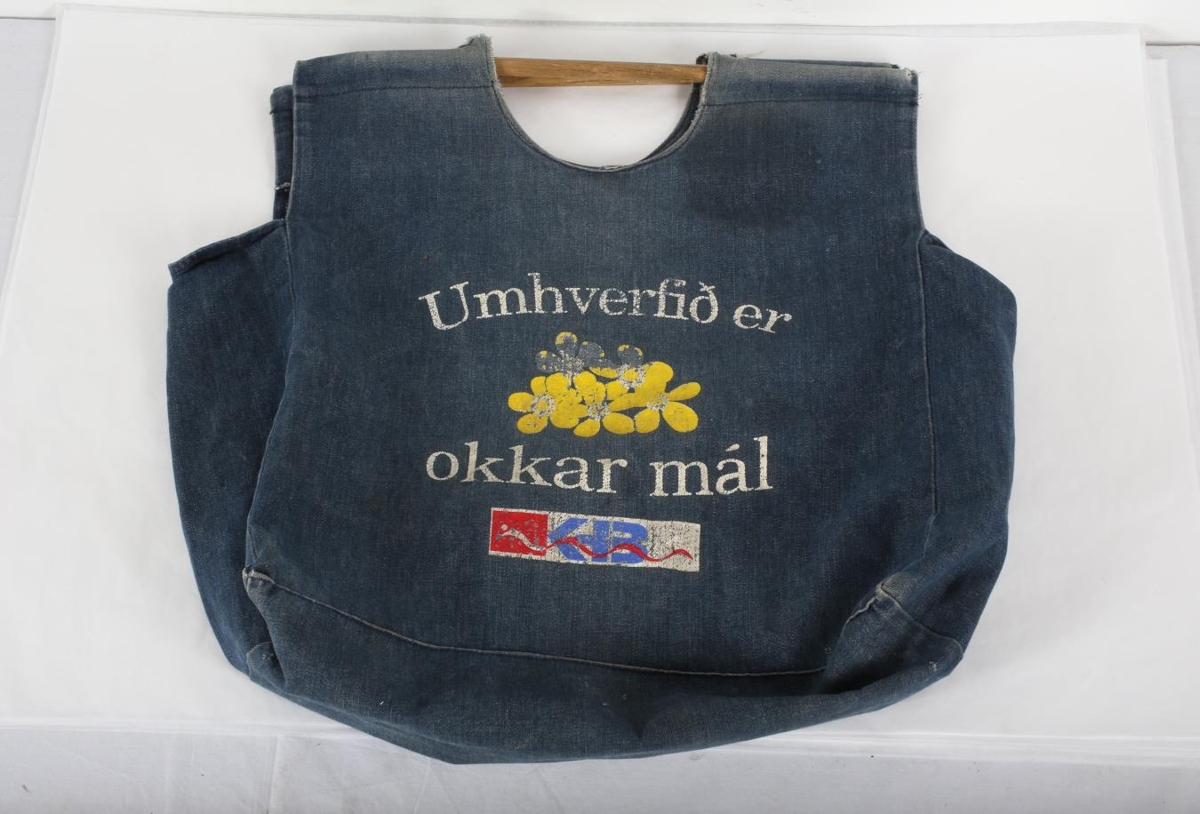 Fjölnota innkaupapoki úr gallaefni. Höldur úr tré - merktur KHB. Á honum stendur "Umhverfið er okkar mál". Mikið notaður og farinn að láta á sjá.