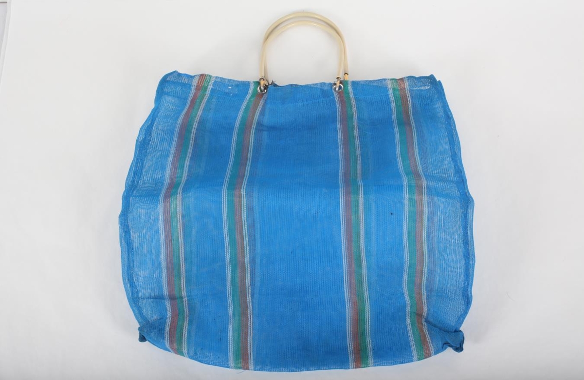 Innkaupapoki úr plasti. Blár með hvítum, rauðum og grænum röndum og hvítum plasthandföngum.