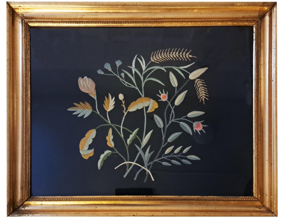 Útsaumsverk eftir Sigríði Jónsdóttur húsfreyju á Stóruvöllum í Bárðardal í tréramma undir gleri. SIgríður saumaði myndina á Laugarlandsskóla veturinn 1886-1887. Útsaumað blómamynstur, kúnstbróderi með varplegg, úr lituðu ullarbandi á svart ullarefni.