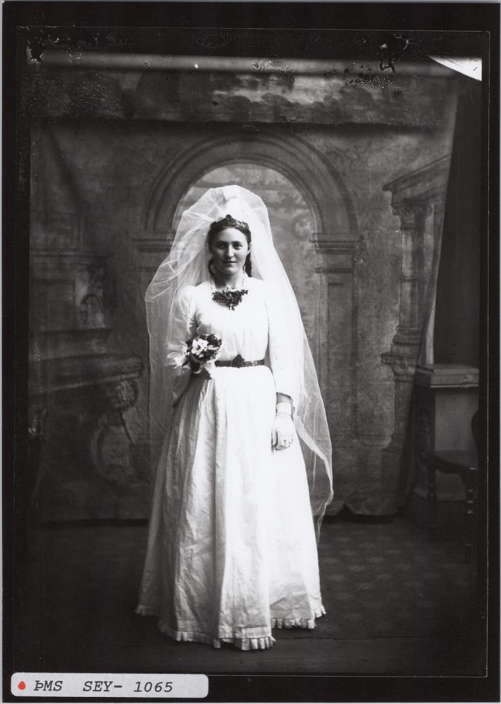 Ung kona í hvítum skautbúning með langa slæðu. Hún klæðist hvítum hönskum og heldur á blómvendi. Líklega brúðarkjóll.