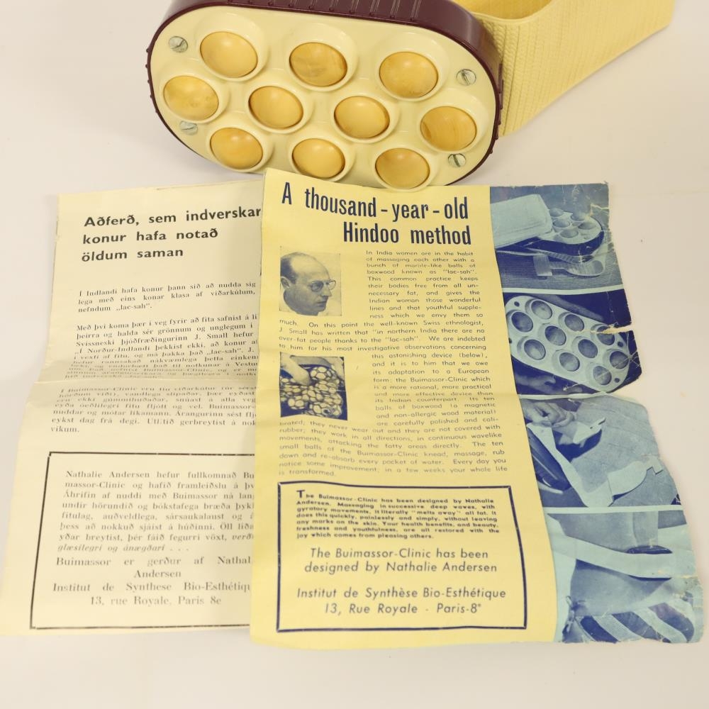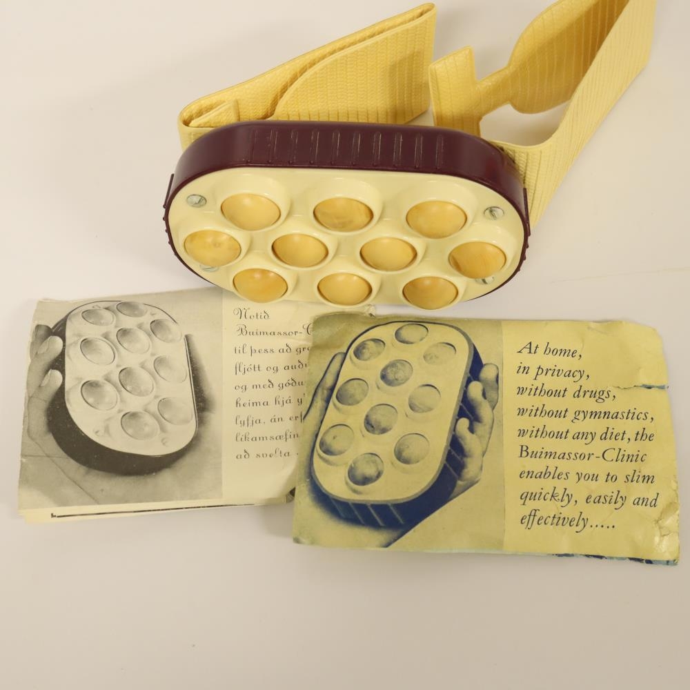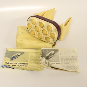 Nuddtæki í upprunalegum umbúðum sem er plastveski með rennilás. Á tækinu er áletrunin Buimassor. Gefandi: Ragnar Jónsson, býr í Kópavogi. Móðir Ragnars, Lilja Magnúsdóttir (1930 - 2023) átti nuddtækið. Ömmusystir Ragnars, Ásta Thorstensen (1907 - 1999) átti tækið í upphafi. Upprunastaður: Reykjavík.