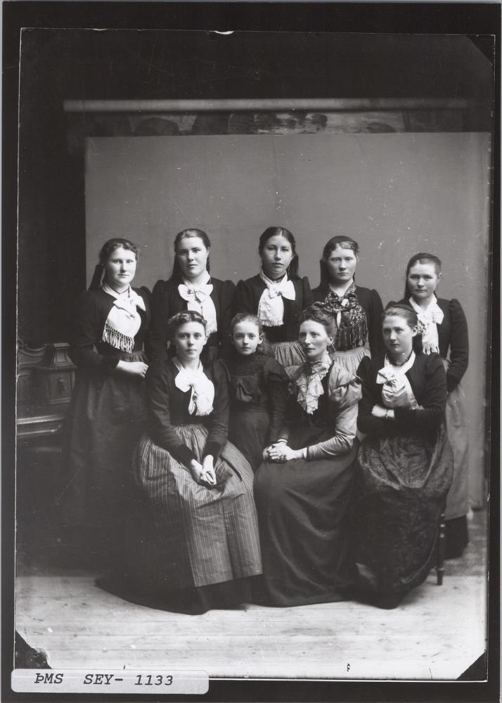 Hópmynd. Jórunn Guðmundsdóttir saumakona (neðri röð 2.f.h.) ásamt sjö ungum konum og einni telpu.