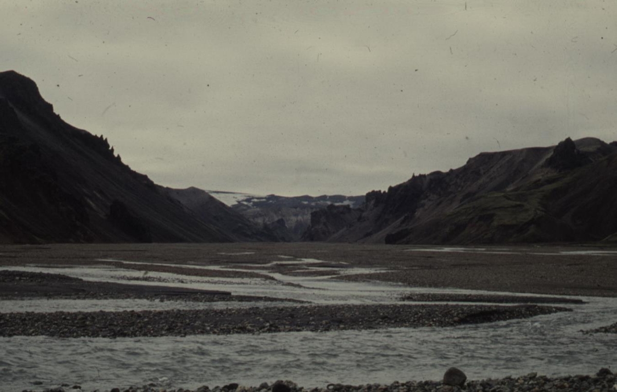 Landslagsmynd af á, fjöll og jökull í bakgrunni.
