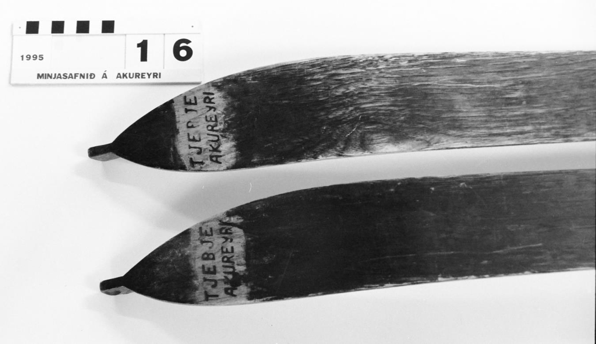 Glærlökkuð og að neðan eru þau svört. Á skíðunum hafa verið gormabindingar