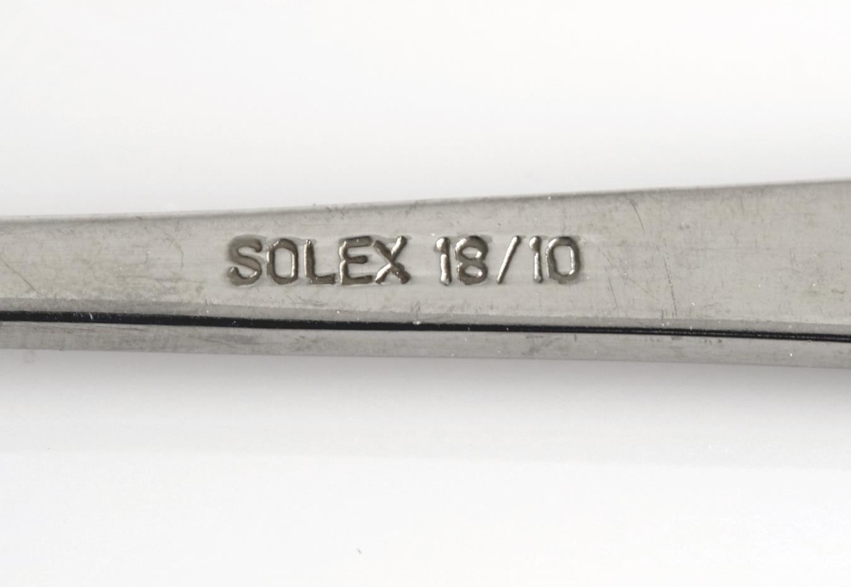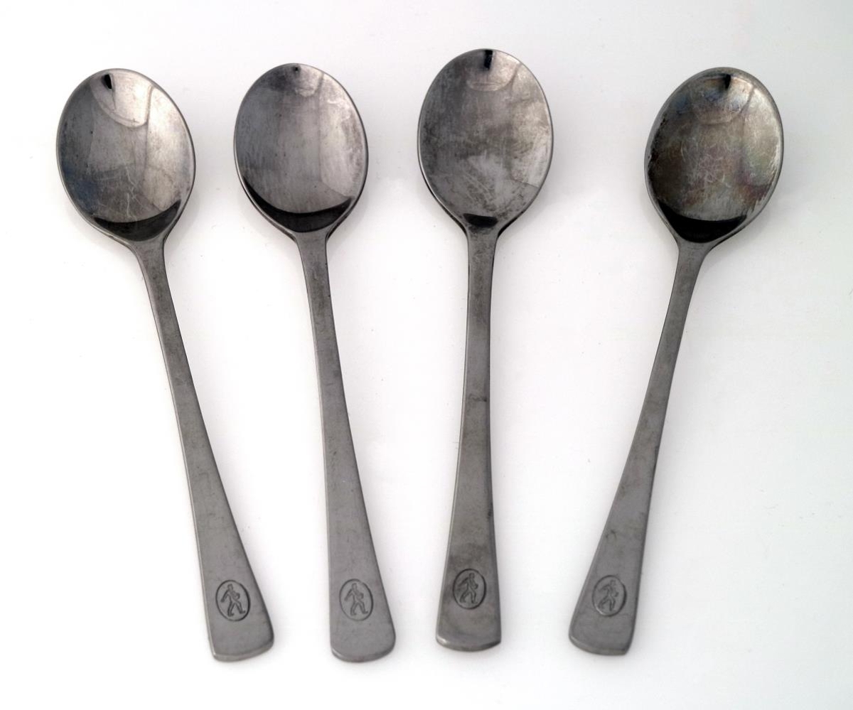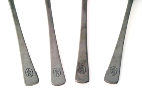 Fjórar teskeiðar með merki Búnaðarbanka Íslands. Merkið er grafið í enda haldsins, í framhlið skeiðanna. Merki bankans Á bakhlið haldsins er grafiið "SOLEX 18/10". Framleiðandi skeiðanna er því Solex og 18/10 stendur fyrir efnablönduna, en skeiðarnar eru úr ryðfríu stáli. Skeiðarnar eru 13,7 x 3 cm að stærð.