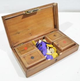 Kassi með spilapeningum. Lásinn er laskaður. Í kassanum eru fjórir minni trékassar með loki. Lokin eru hvert um sig merkt með einu spilatákni s.s. hjarta, spaða, tígul og lauf. Í kössunum þannig merktum eru spilapeningar í mismunandi litum og mismunandi að lögun. Sumir þeirra virðast gerðir úr tönn eða beini.