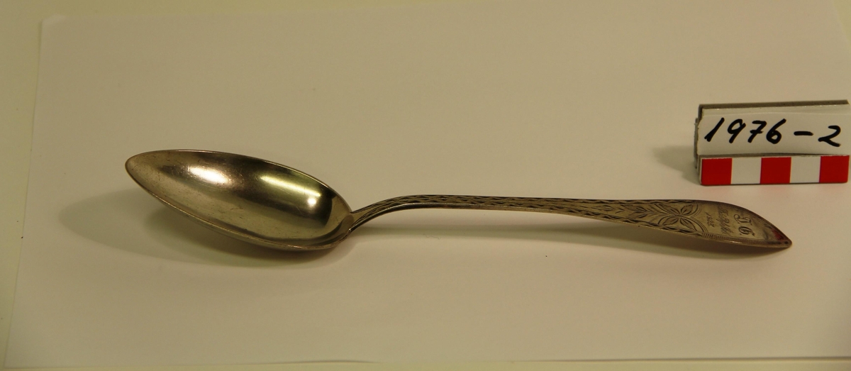 Viðurkenning til Jónínu Guðlaugar Gestsdóttur fyrir 20 ára vinnukonustarf á Sveinhúsum í Vatnsfjarðarsveit. Jónína var fædd 4. ágúst 1880, og dáin 30. mars 1972. Elín Guðmundsdóttir, Reykjavík afhenti skeiðina (gefandi).