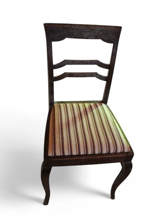Brúnn borðstofustóll.Ofið áklæði á sessu, röndótt.