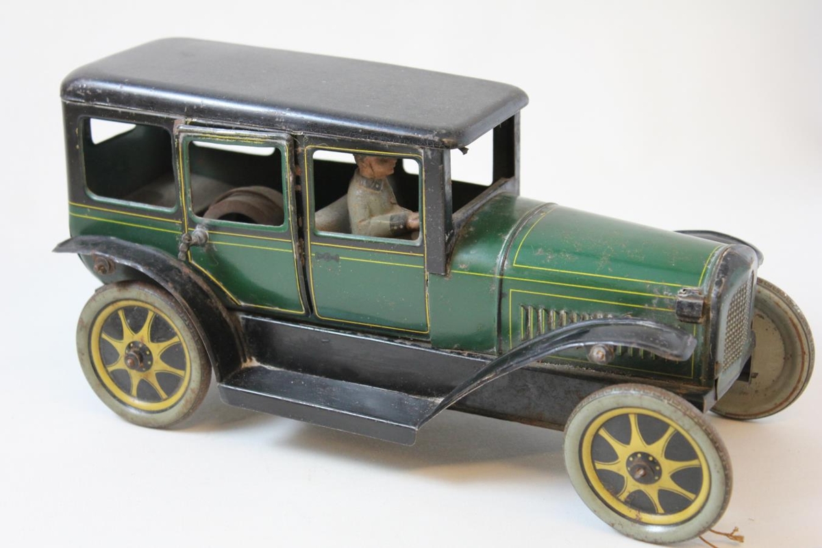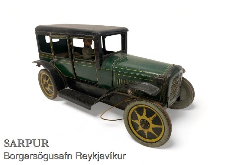 Leikfangabíll úr blikki, framleiddur í Þýskalandi. Bíllinn er grænn og svartur og málaðar á hann gular línur. Það er rafmagnsmótor í bílnum, hann hefur verið með ljósum að framan en ljósin hafa dottið af.