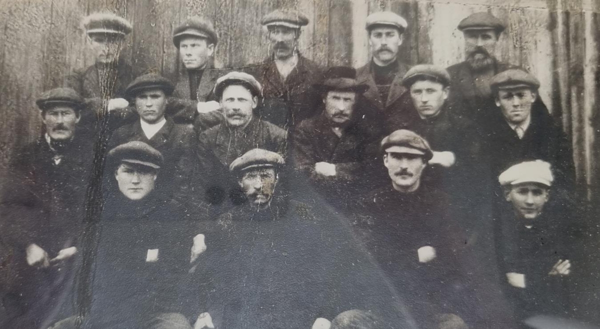 15 karlmenn, áhöfn á bát. Ef til vill áhöfn Páls Grímssonar í Nesi, Selvogi, og hann með hatt og hendur fyrir framan bringu fjórði f.v. í miðröð.