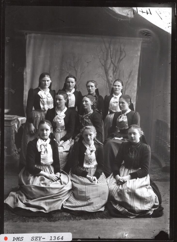 Jórunn Guðmundsdóttir saumakona (í miðri miðröð) ásamt 9 saumastúlkum.