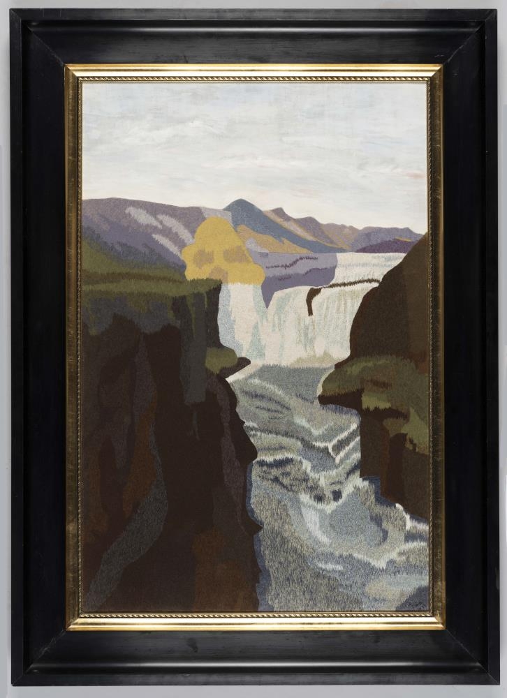 Útsaumuð og máluð mynd af Gullfossi. Fossinn, gljúfrið fyrir neðan hann og hæðirnar fyrir ofan hann eru saumuð í mismunandi litum. Himininn er málaður, líklega á silki. Í neðra hægra horni er merking saumuð með svörtum þræði, "Þóra 1932". Myndin er í svörtum ramma, 87 cm á hæð og 63 cm á lengd. Breidd hans er 7 cm, en gylltur innri rammi er 2 cm breiður. Innri ramminn er með skornu mynstri á innri brúnum. Myndopið er 69 cm á hæð og 45 cm á breidd.
