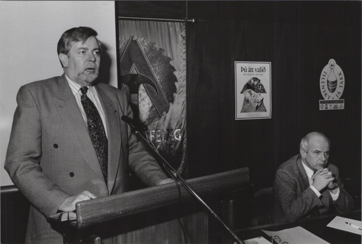 Sighvatur Björgvinsson, ráðherra á fundi hjá Samiðn um vanda skipasmiðaiðnaðarins. Mars 1994.