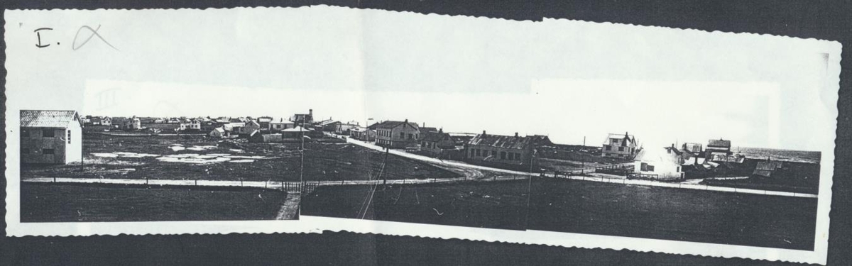Hinrik segir: "Stokkseyri, vesturþorp. Panorama; syrpa tekin af þaki Ranakots líklega sumarið 1952 eða 1953. Tekið á bandaríska ARGUS vél, 35 mm. Merking er miðuð við að haldið sé réttsælis frá suðaustri, lengja 1, en þar sér í vinstra myndjarði á vesturhluta "nýja" skólans. Hringurinn lokast hér ekki að fullu; í hægra myndjaðar raðar IV vantar suðaustursýn að Móhúsum og þeim hluta skólans sem ekki sést á I."