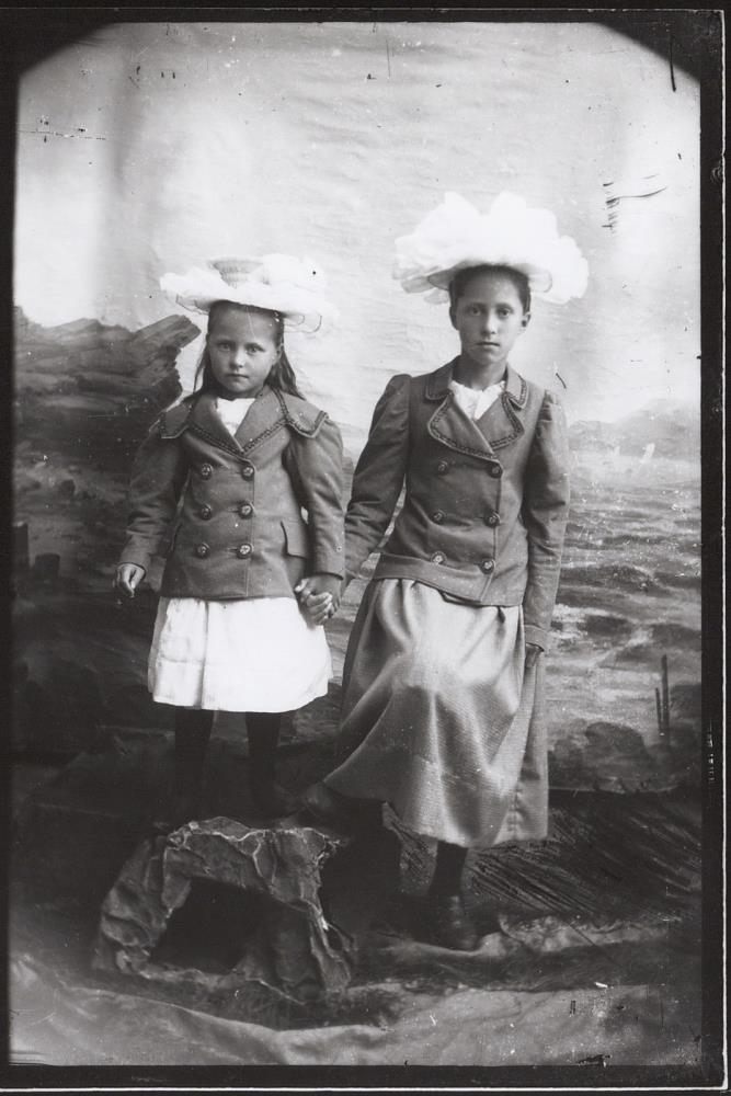 Systurnar f.v. Abelína Andrea Gunnarsdóttir og Hansína Gunnarsdóttir haldast í hendur. Þær eru í kápum yfir kjóla og með skrautlega hatta. Fjölskylda þeirra var kaþólsk og þær gengu í Landakotsskóla.