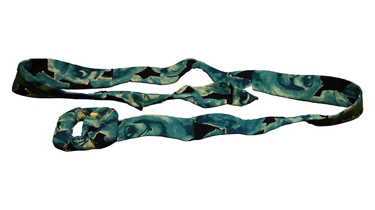 Belti úr blá munstruðu efni og hefur Kristín klætt syglju einnig