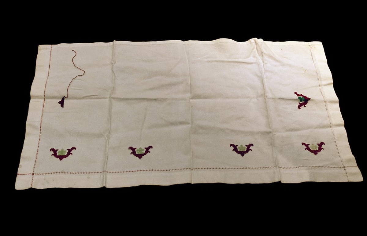 Krem-hvítur kommóðudúkur með útsaum í vínrauðu og grænum lit. Hefur átt eftir að klára að gera dúkinn.