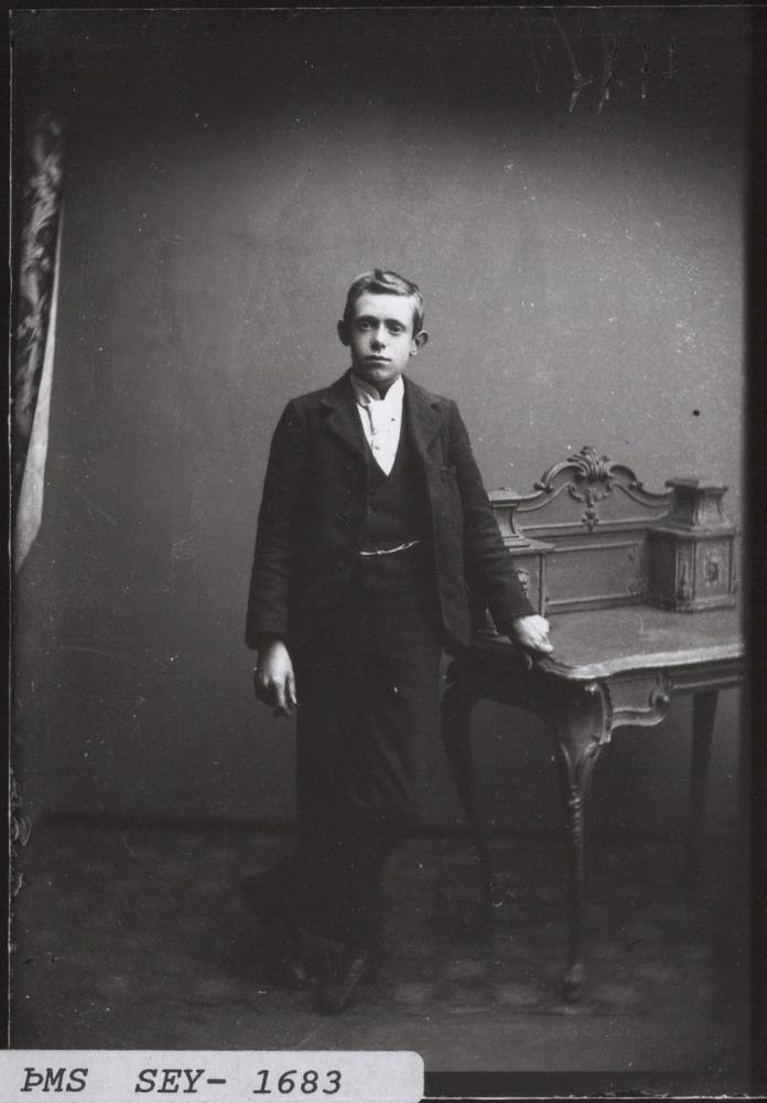 Piltur stendur við skrifborð á ljósmyndastofu. Hann er með hökuskarð og er klæddur í jakkaföt með hvítt bindi.