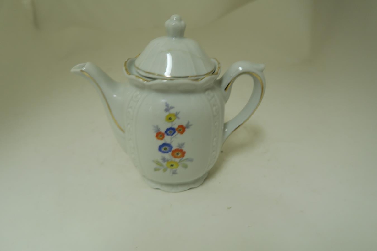 með loki. Úr postulíni, hvítt með gylltum röndum. Blómamunstur málað eða