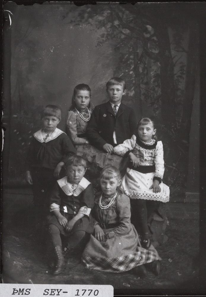 Hópmynd, sex prúðbúin börn. Þrjár stelpur og þrír drengir. Sennilega systkini.