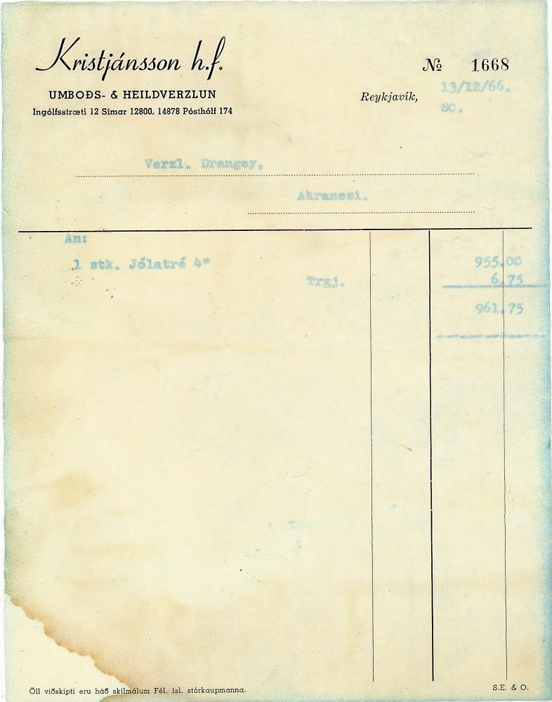 Kristjánsson hf umboðs- og heildverzlun skrifar reikning fyrir sölunni til Verslunarinnar Drangeyjar 13.12.1966 og tréið kostaði 961- kr. og 75 aura.